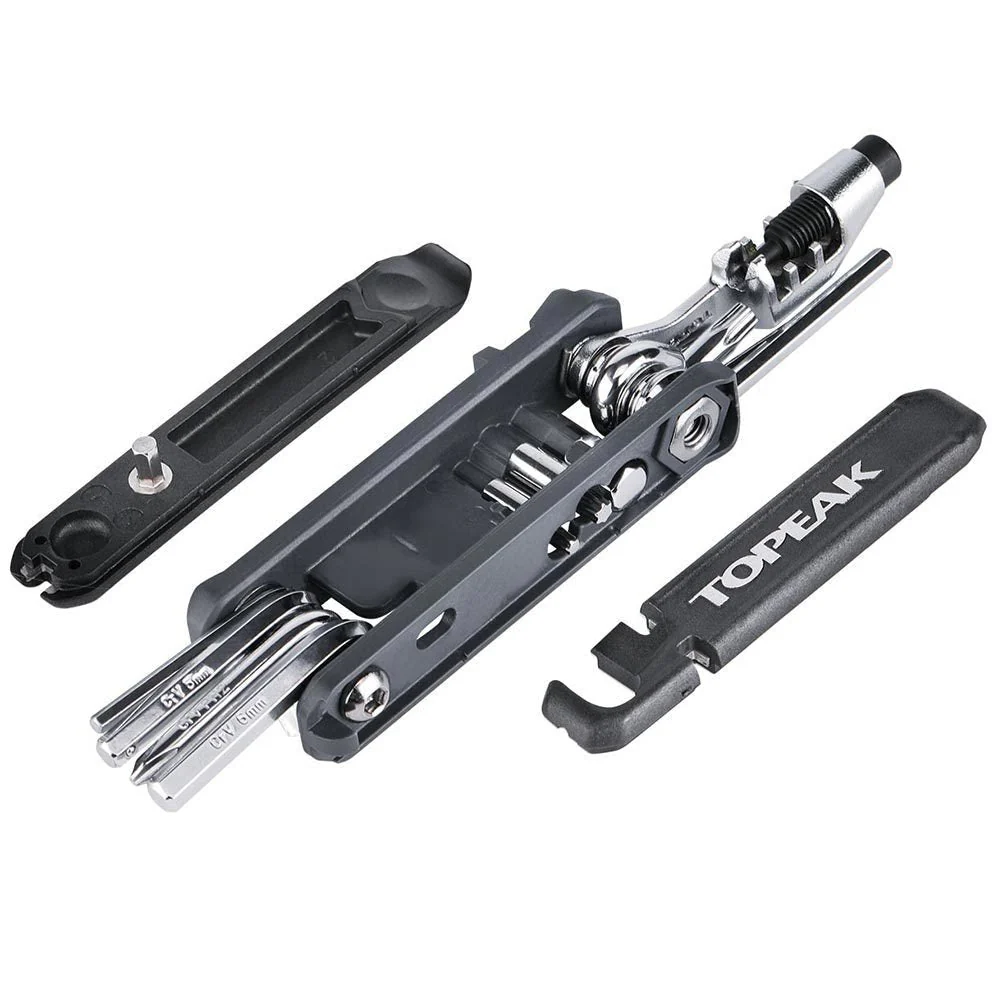 An award winning 21 functions multi-tool with updated design to store T15, T25, 8mm hex tool bits and side mounted tire levers securely. Includes self-tightening tool (T25 Torx® bit) and Presta Core Tool to tighten or remove two-piece Presta valve cores. The Hexus X is an excellent choice for both road and mountain bike riders.